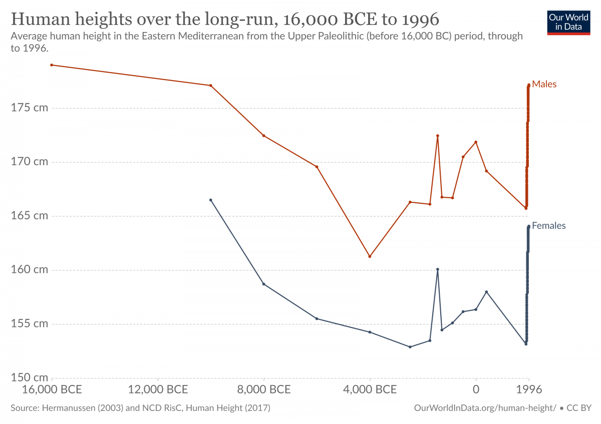 1346 és 1353 között a Fekete Halálként emlegetett pestisjárvány Európa lakosságának mintegy 60%-át kipusztította, következésképpen akik életben maradtak, az addiginál sokkal több élelemmel rendelkeztek, emellett pedig kevésbé zsúfoltan éltek, ami miatt a járványok is nehezebben tudtak már terjedni. Az eredmény: az emberek a 15. és a 16. században magasabbra nőttek, Angliában például annyira meglódult a szekér, hogy a férfiak átlagos testmagassága mindössze 3,81 centiméterrel maradt el a mai, 175 centis magasságtól.