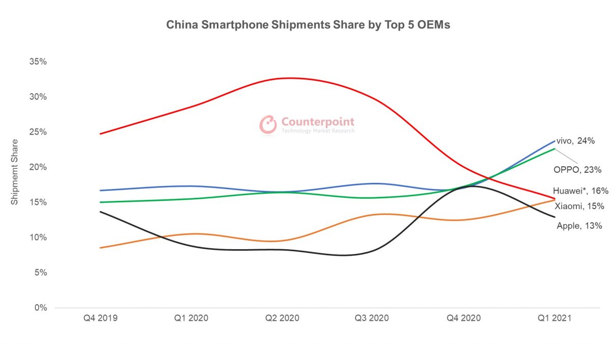 A Counterpoint Research piacelemző cég első negyedéves mobilpiaci jelentéséből már tisztán látható, hogy hova vezettek ezek a trendek, aminek látszólag szinte mindenki örülhet: a Samsung annak, hogy az eladott készülékek számában sikerült visszaszerezniük az első helyüket, az Apple annak, hogy az eladásokból származó bevételek szempontjából hatalmas előnyre tettek szert, míg a Xiaomi, a Vivo és az Oppo annak, hogy 2021 elején is ők tudták felmutatni a legnagyobb növekedést. A történetnek egy nagy vesztese van, a Huawei, ami úgyszólván eltűnt a térképről.