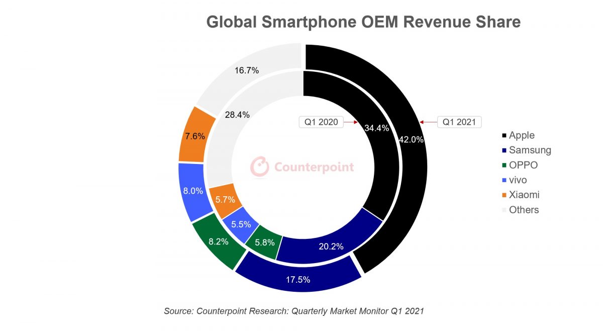 Ezeknek a számoknak az Apple örülhet a legjobban, hiszen a bevételeknek a 42%-a hozzájuk vándorolt, míg a Samsung a rekordmennyiségű eladott készülék ellenére is csak 17,5%-os részesedéssel bír. A két nagy gyártó után a fentebb már említett három kínai gyártó következik, az Oppo, a Vivo és a Xiaomi, amelyek részesedése 8% körül mozog.