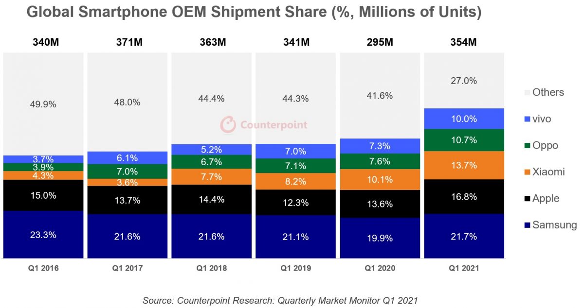 Hogy 2021 a mobilpiac szempontjából nem egy átlagos év lesz, azt már év elején is lehetett sejteni: az Apple tavaly ősszel a szokottnál jó egy hónappal később, a Samsung viszont jóval előbb mutatta be az új csúcskategóriás készülékeit, mindezt egy olyan piacon, ami a tavalyi év első felében tapasztalható visszaesés után már 2020 második felében óriási feltámadást produkált. Mindeközben a Huawei az amerikai kereskedelmi embargó miatt egyre szorultabb helyzetbe került, miközben a többi kínai gyártó évek óta rendületlenül növeli a részesedését.
