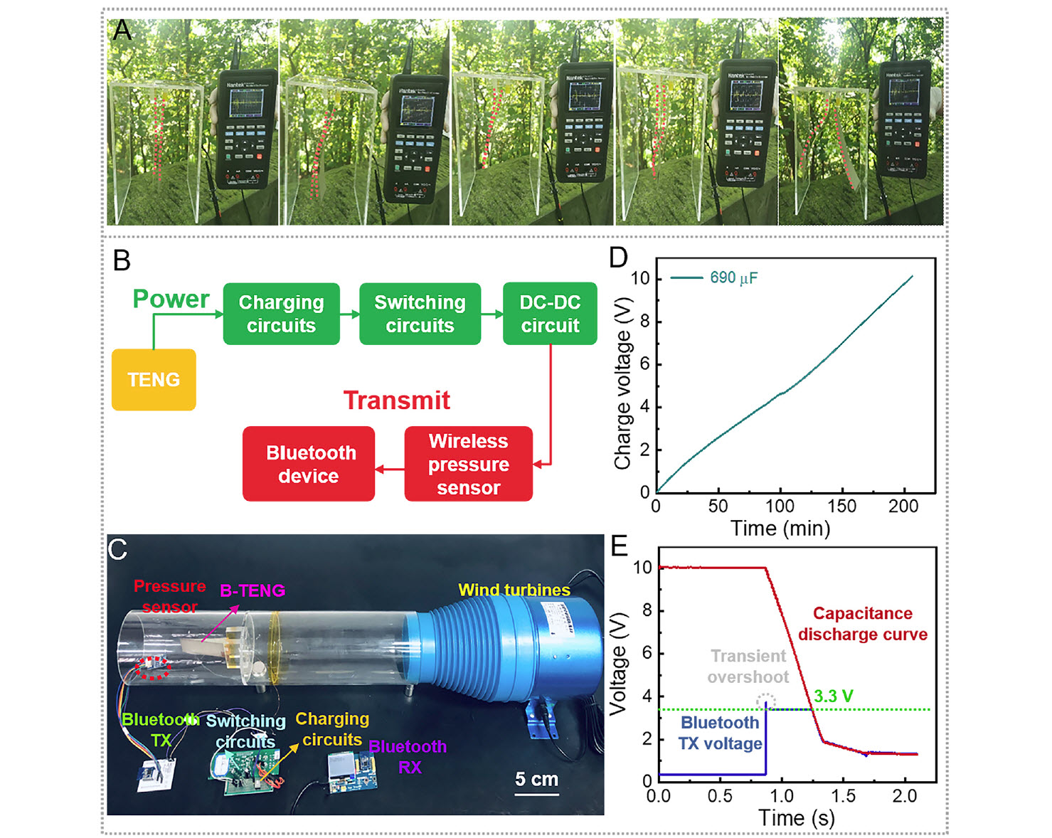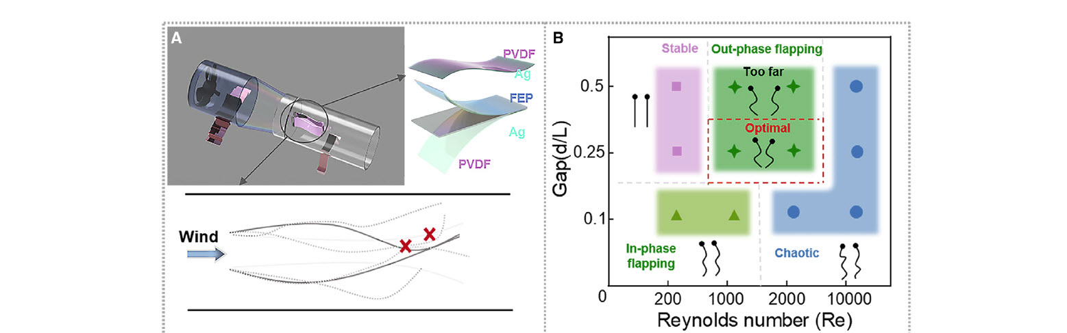 A B-TENG belsejében két műanyag szalagból készült szalag lengedezik, melyek mindegyike egy-egy ezüst elektródát hordoz, egy cső belsejében. Amikor a levegő átáramlik a csövön, a műanyag csíkok periodikusan egymásnak csapódnak, és újra elválnak egymástól. A folyamat feltölti őket statikus elektromossággal, akárcsak a megfelelő anyagból készült szőnyegek a hozzájuk dörzsölődő cipőket.