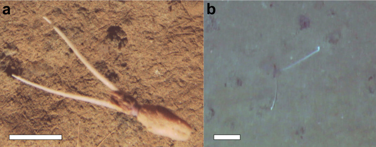 A brit SMARTEX (Seabed Mining and Resilience to Experimental Impact) program keretében végzett óceáni megfigyelések során a kutatók egy új fajra bukkantak az óceán mélyén, aminek a viselkedése nem hétköznapi: az állat eltemette magát az üledékbe, méghozzá fejjel lefelé. Ilyen viselkedést lábasfejűek körében ritkán figyeltek meg a szakértők - az, hogy az élőlény fejjel lefelé pozícionálta magát teljesen új felfedezést jelent, amire a magyarázatot még keresik a kutatók.