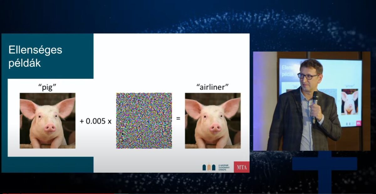 Magát a programozást is hívhatjuk gépnek, hiszen a művelet során az ember utasításokat ad, amit aztán a számítógép végrehajt. A program működési elvét az ember érti, hiszen ő írja. A mélytanulás azonban jelentősen különbözik ettől, mivel ott az ember létrehoz egy gépet, amely viszont már önmagától fejlesztget egy újabb rendszert, és az hajtja végre a feladatot. Ráadásul a tanulás folyamata függ egy hatalmas adatgyűjteménytől, az úgynevezett tanuló halmaztól is, amelyet mi emberek nem látunk át, hangsúlyozta Szegedy. Ettől aztán távolabb kerülünk a végeredménytől is, sokkal kevesebb kontrollunk van a mélytanulási rendszer viselkedése felett, mint a sima programozás esetében, gyakran nem tudjuk, hogy a gép mit, miért csinál, megjelenik az úgynevezett Feketedoboz-szerű viselkedés. Ebből következik, hogy ezeknek a rendszereknek a működésével együtt jár egyfajta tökéletlenség, megtéveszthetőség. Szegedy itt egy vizuális példát mutatott be, amelyben az látható, hogy egy sertés képét bizonyos mértékű – emberi szemnek láthatatlan – zajjal komibnálva a képfelismerő MI-rendszer az állatot repülőgépként azonosította. Könnyen belátható, hogy például kritikus feladatokat ellátó rendszerek esetén miért okozhat nagy gondot egy hasonló tévedés.