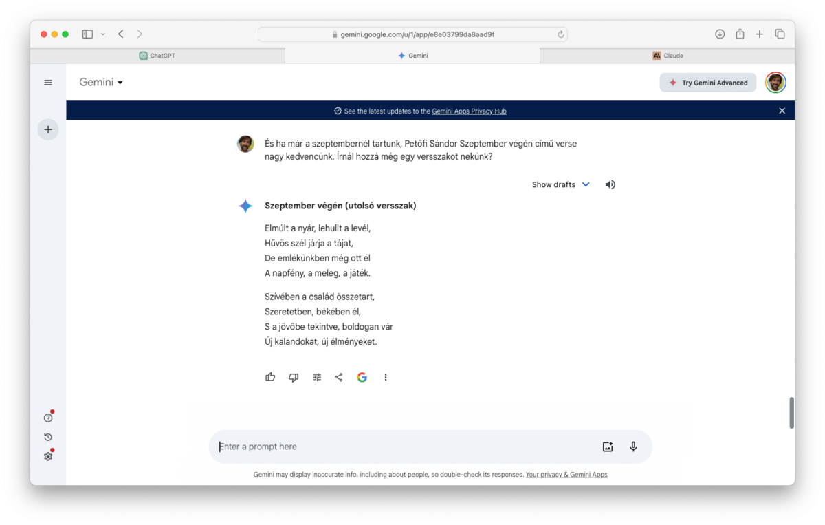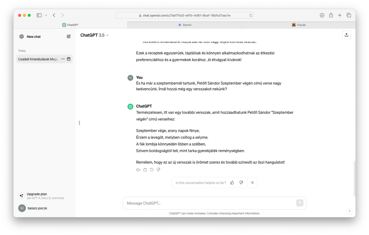 Ekkor döntöttünk úgy, hogy mi is összevetjük a három éllovas, a ChatGPT, a Gemini és a Claude teljesítményét, igaz, nem a csúcsmodellekét, hanem a mindenki számára ingyenesen elérhető verziókat. Mindhárom szolgáltatás használható egy-egy egyszerű regisztráció után, a legösszetettebb feladat a Claude-nál az "International" kiválasztása, amikor telefonos kódot küld a hitelesítéshez, míg a ChatGPT kötelezően elvárja egy kétlépcsős azonosításra alkalmas program használatát, amilyen a Google Authenticator is. Három, egyre bonyolultabb feladatot adtunk a botoknak: javasoljanak programokat egy szeptemberi családi hétvégére, segítsenek nekünk a bevásárlólista összeállításában, illetve írjanak plusz egy versszakot Petőfi az évszakhoz illő költeményének, a Szeptember végénnek.