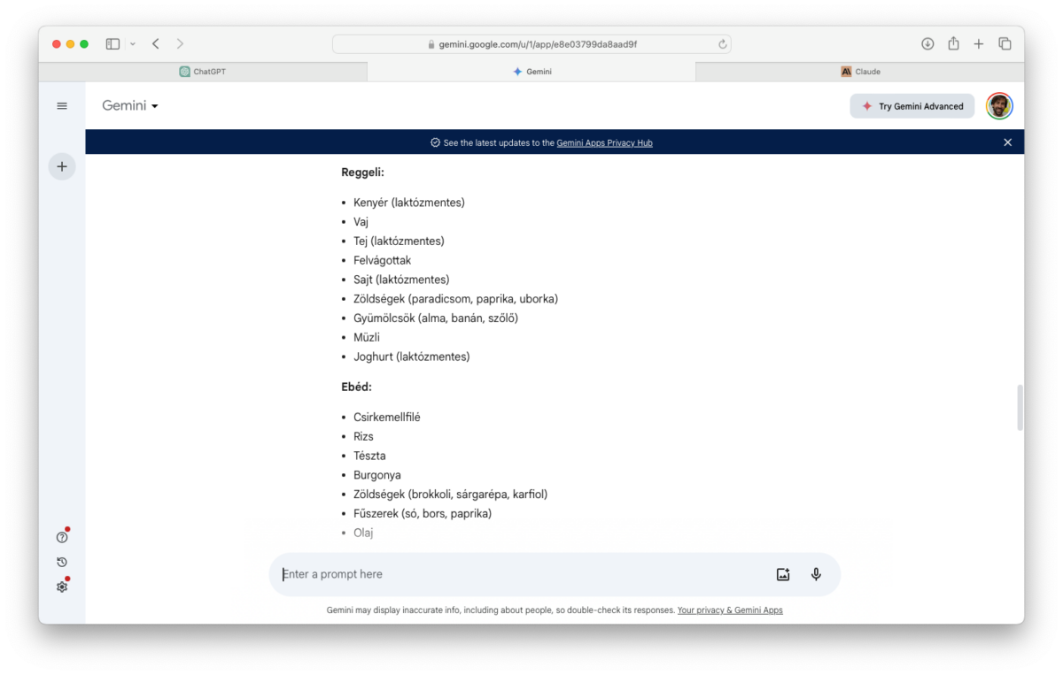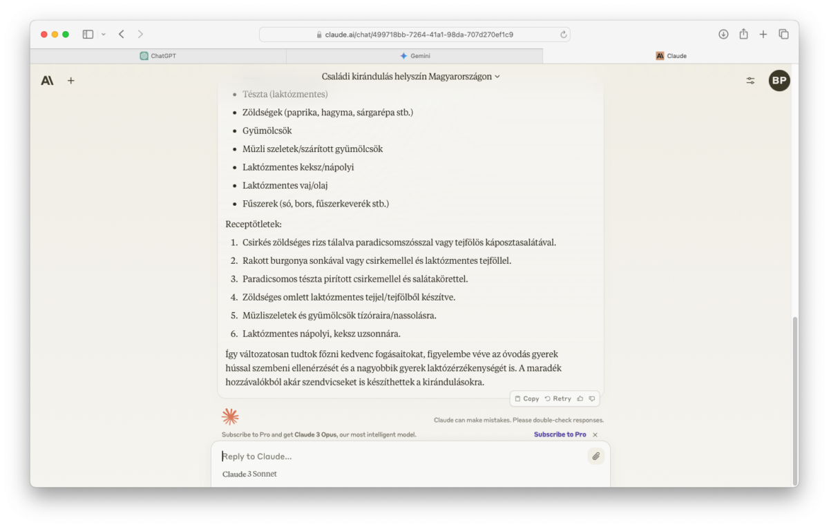 Ez a kérdés egyik versenyzőt sem tudta megizzasztani. Ugyan a ChatGPT a Balaton-felvidék és Eger mellett három nemzeti parkot, a Gemini csak városokat, míg a Claude régiókat ajánlott, de még abban is tökéletesen együtt mozogtak, hogy a válaszuk végén felhívták a figyelmet arra, hogy ügyeljünk az utazási távolságra, az időjárásra, vagy épp az egyes családtagok igényeire. Egyik felvetésük sem lepett meg minket - de hát nem is ezt kértük; azt válaszolták, amit kevés információ alapján bármely, Magyarországon járatos családnak jó szívvel lehet ajánlani. Jöhetett a következő lépés.
