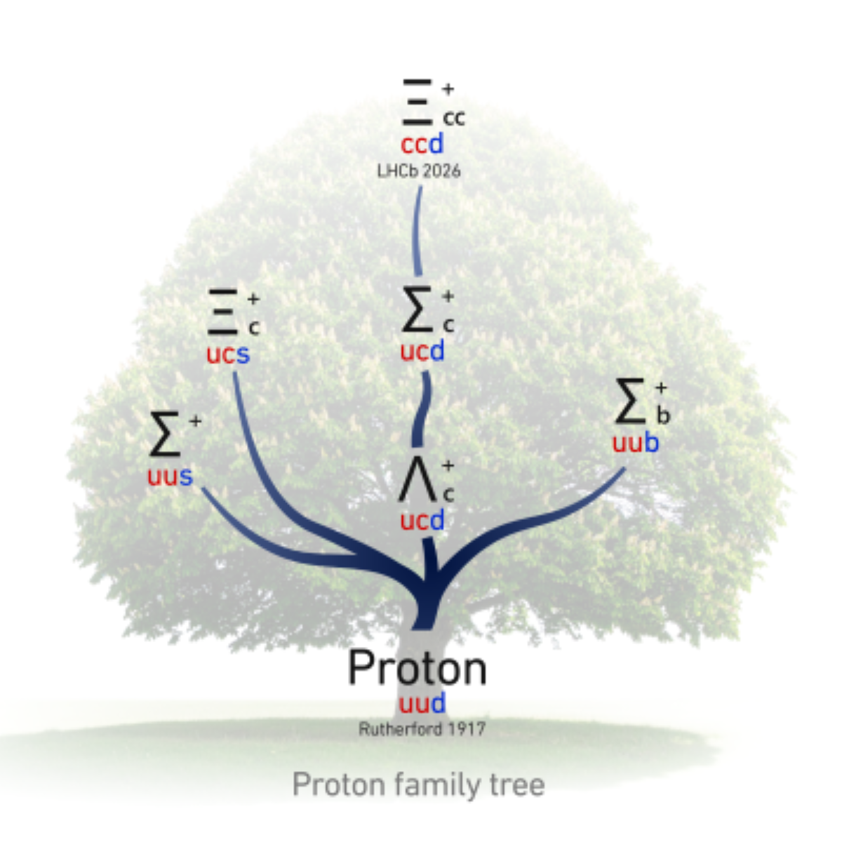 A jól ismert proton, ami az atommagot alkotja, három kvarkból áll - két fel és egy le kvarkból, ezért jele uud (up up down, ami angolul a fel és le kvarkokat jelöli). A kvarkoknak alapvetően hat különféle típusa (íze) ismert: a fel és le kvarkok a könnyűek közé tartoznak, míg a bájos, a furcsa, a felső és alsó kvarkok sokkal nehezebbek náluk. Ha egy háromkvarkos rendszerben a le kvark mellett megjelenik egy nehezebb kvark is, például egy bájos kvark, esetleg a le kvark helyére egy furcsa kvark lép, akkor “feljebb kerül” a protoncsaládfán.