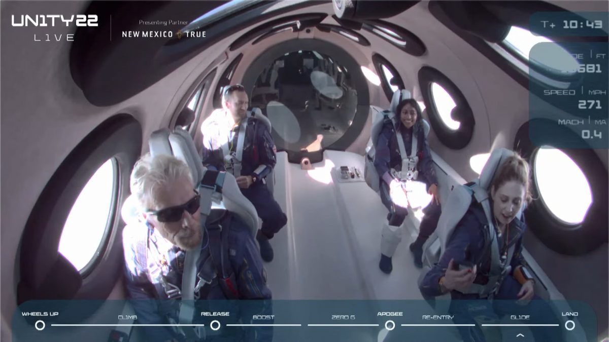 A 70 éves üzletember - aki a Forbes listája szerint jelenleg a világ 500. leggazdagabb embere - nem egyedül utazott az űrbe, az űrrepülőn rajta és a két pilótán kívül ott ült a cég három prominens képviselője is: Beth Moses, a cég űrhajós kiképzésének vezetője, Colin Bennett, a Virgin Galactic vezető mérnöke és Sirisha Bandla, a vállalat kormányzati kapcsolatokért és kutatásért felelős alelnöke. Ez volt a VSS Unity első útja, amikor a pilótákon kívül utasok is ültek az űrrepülőben.