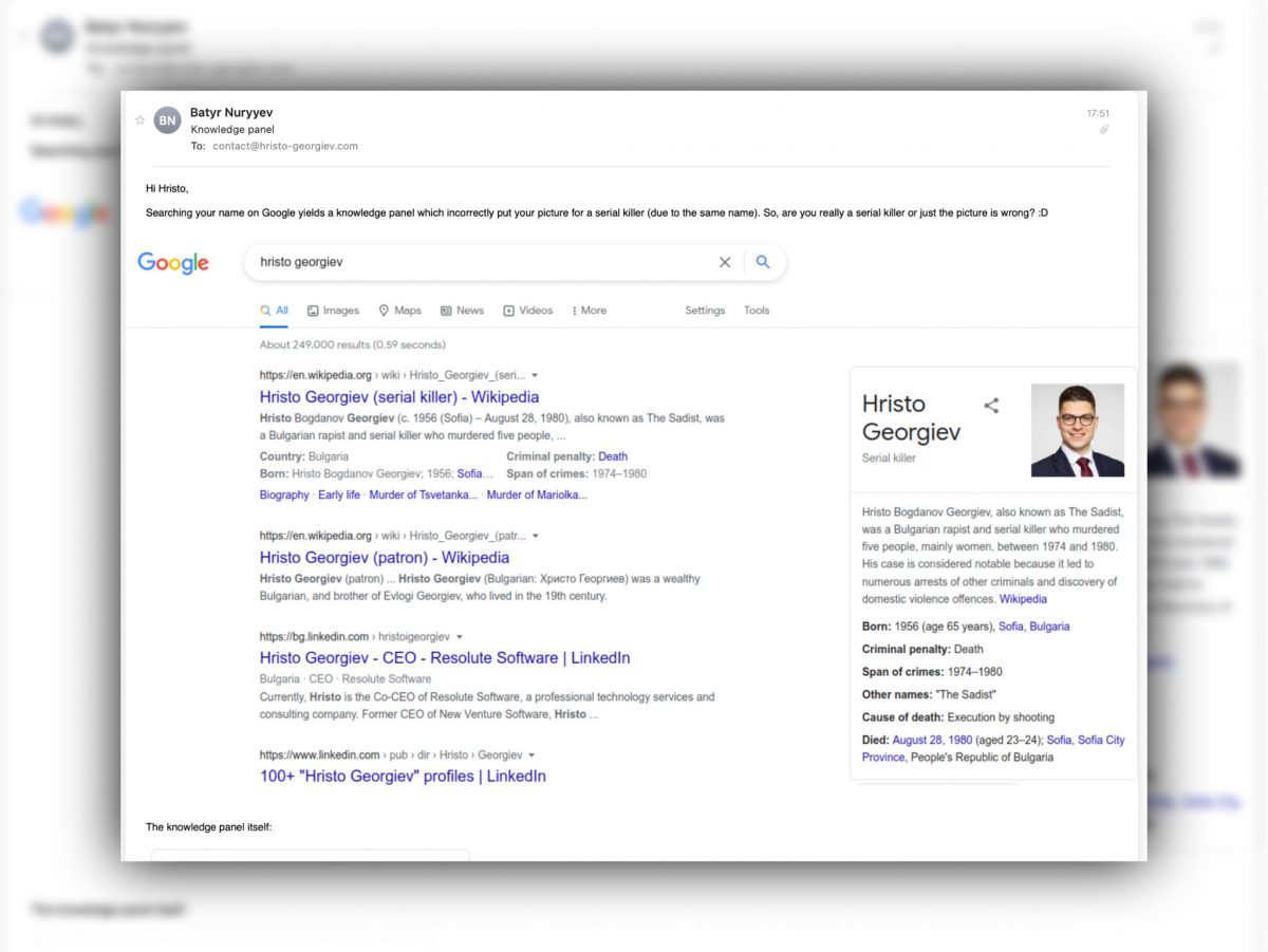 Hriszto Georgiev, "a szadista" egy rettegett bolgár sorozatgyilkos volt. A Wikipedia szerint 1974 és 1980 között öt embert ölt meg, javarészt nőket. 1980 augusztusában kivégezték. Egy másik Hriszto Georgiev a weboldala szerint Bulgáriában nőtt fel, majd Svájcba költözött, miután eladta a startupját. Jelenleg a helyi Raiffeisennél dolgozik. Utóbbi Georgiev a napokban kapott egy emailt egy barátjától, amely szerint az ő képe szerepel rettegett névrokona története mellett a világ legnépszerűbb keresőjében. Mivel a Google az ilyen kiemelésekhez gyakran a Wikipediát használja forrásként, a férfi először azt gyanította, hogy viccből oda tölthette fel valaki a fényképét, de nem ez történt.