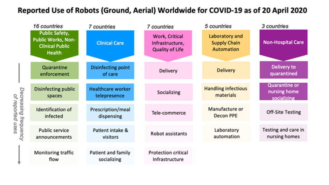 A Texas A&M Egyetem és a Center for Robot-Assisted Search and Rescue Intézet robotikával foglalkozó munkatársai több mint százhúsz publikációt megvizsgáltak Kínából, az Egyesült Államokból és tizenkilenc másik országból azzal kapcsolatban, hogyan használják a robotokat a koronavírus-járvány idején. Megállapították, hogy azok szinte minden szempontból figyelemre méltó szerepet játszanak a válság kezelésében földön és égen. Szemléltetésképp elkészítették az alábbi ábrát: