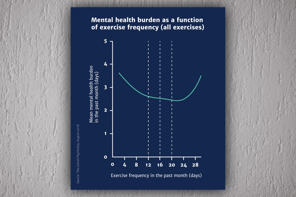 A tanulmány készítői természetesen arra is kíváncsiak voltak, hogy mennyi mozgás a legideálisabb. Ahogy a lenti grafikonon is látható, a testmozgás akkor bizonyult a leghatékonyabbnak, ha havonta 12-24 nap közé esett a mozgással töltött napok száma, efölött viszont a válaszadók mentális egészsége erősen visszaesett. A kutatók ebből azt az általános szabályt vonták le, hogy a legjobb, ha heti 3-5 alkalommal végzünk rövidebb, 30-60 perces edzéseket.