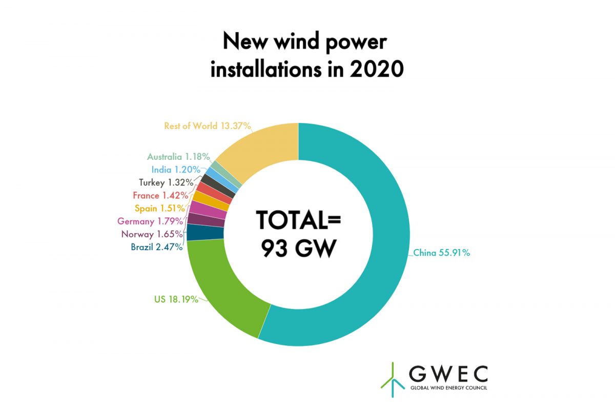 Tavaly globálisan rekordot döntött ez a telepítési sebesség: a Földön 93 GW-nyi, a 2019-es értéknél 53%-nál nagyobb új kapacitást helyeztek üzembe. Az új erőművek háromnegyedét mindössze két országban, az USÁ-ban és Kínában építették fel. (Hazánk kivétel a trendek alól: nálunk 2010 óta gyakorlatilag be van tiltva a szélerőmű-építés.) Így a világ teljes szélenergia-hasznosítási kapacitása 743 GW-ra nőtt, ami évi 1,1 milliárd tonna CO2 kibocsátását váltja ki. Ez Dél-Amerika teljes jelenlegi éves CO2-emissziójával összemérhető érték.