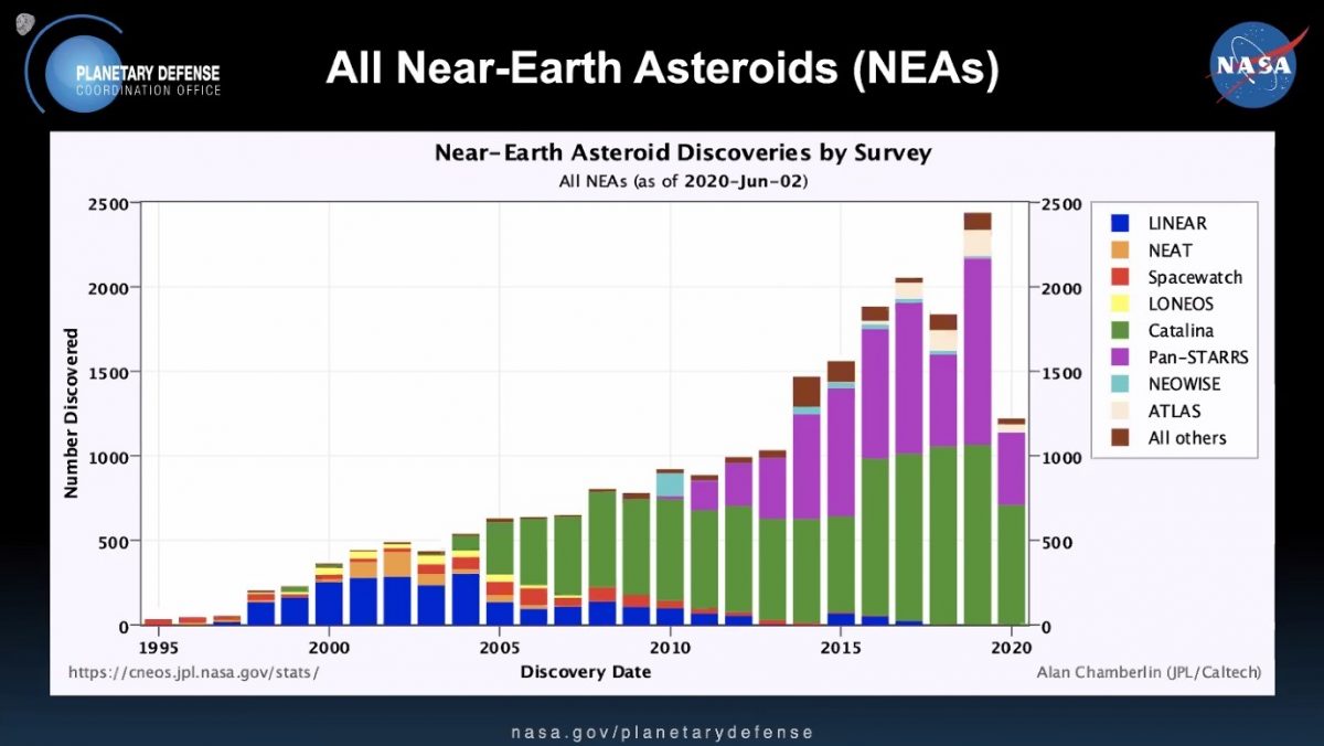 A NASA-n belül 2016-ban alakult meg a Planetary Defence Coordination Office (Bolygóvédelmi Koordinációs Iroda), aminek dedikált feladata a bolygónkra leselkedő aszteroidák felkutatása és elhárítása. Amy Mainzer, a NASA NEO Survaillance Mission, vagyis a földközeli égitestek felderítésére indított küldetés vezetője elmondta, hogy az űrvédelmi program első fázisát már 2011-re teljesítették, ekkorra sikerült feltérképezniük az egy kilométernél nagyobb átmérőjű, a Földre potenciális veszélyt jelentő aszteroidák 90%-át. A dolog nehezebbik része viszont csak ezután következik, hiszen a program következő fázisában ugyanezt meg akarják tenni a 140 méter átmérőnél nagyobb aszteroidákkal is, amikből sokkal több van, a detektálásuk pedig kifinomultabb műszereket igényel. A munka nagyságát jól jellemzi, hogy 2020-ban eddig mintegy 208 ilyen aszteroidát találtak, miközben Mainzer szerint a számuk több százezerre tehető. Ezeknek a 140 és 300 méter közötti aszteroidáknak eddig kevesebb, mint a felét sikerült megtalálni, a jelenlegi ütemben még akár harminc évbe is telhet, mire sikerül elérni a kitűzött célt.
