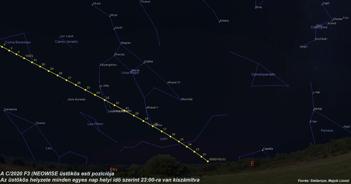 Július végén a Nagy Medve alatt kereshetjük és végre hajnal helyett kora este is megpillanthatjuk, már egészen alapszintűnek számító távcsővel is. A fényessége július közepén várhatóan 2,0-2,5 magnitúdó körül alakul majd, a hónap végére 5 magnitúdóra csökkenve. A Neowise naptávolsága, július 19-én éri majd el a 30 fokot, és 15-e óta tűnik fel a kora esti égbolton.