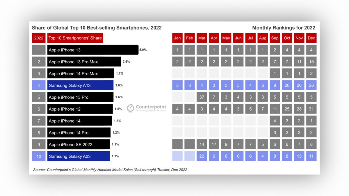 A Counterpoint Research piackutató néhány napja tette közzé az éves listáját a tavalyi év legnépszerűbb telefonjairól, ami még a korábbi évekhez képest is meglepően egyoldalú képet mutat: a tíz legnagyobb darabszámban értékesített telefonból nyolc iPhone, vagyis az Apple összes forgalomban levő telefonja felkerült a listára, ezek mellett viszont csak a Samsung két belépőszintű telefonjának sikerült bekerülnie az első tízbe.