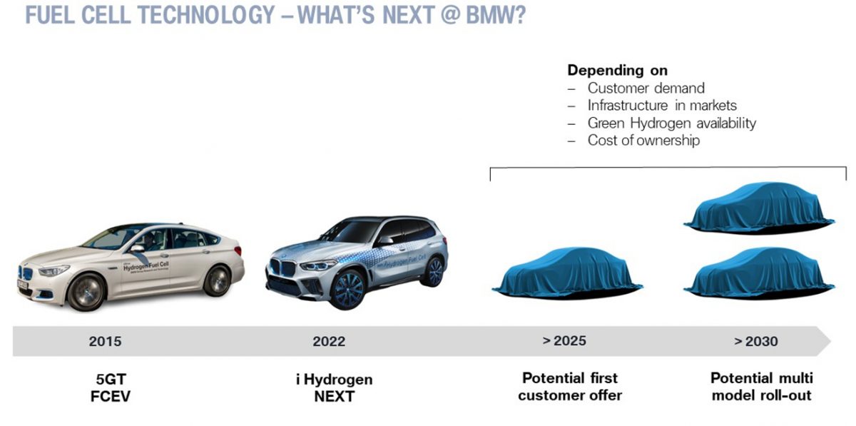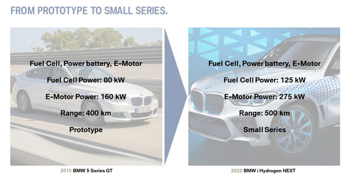 A német márka a Toyotával kötött technológiai transzfer-megállapodást a saját hidrogénautója megalkotásához, technikailag semmi forradalmi újdonságot nem várhatunk az BMW első igazi, sorozatgyártásra tervezett hidrogénautójától. 700 baros, a mai kutakról simán tölthető hidrogéntartályok lesznek benne. A hidrogéncellát egy kicsi, 10 kWh alatti kapacitású lítium-ion pufferakkumulátor segíti majd, ha extra erőre van szükség és ez az akkumulátor tárolja el a lassítások során visszanyert energiát. A tartályokba hat kilogramm hidrogén fér, ezzel 500 kilométeres hatótávot várhatunk majd a kocsitól, vegyes használatban.