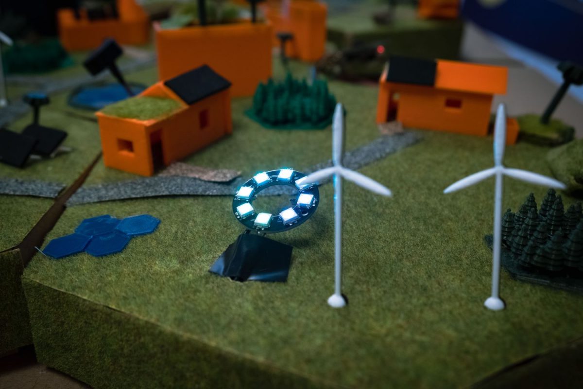 Greenworld Cityben az áramellátásról teljes egészében megújuló energiaforrások gondoskodnak, azaz a napelemek és a szélerőművek a leggyakoribbak. A képen látható LED-gyűrű a település energiatartalékait szimbolizálja, amiből a színek alapján a kép készültekor nem volt hiány a városban.