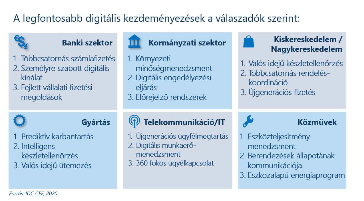 Napjainkban rengeteg vállalat küzd a COVID-19 járvány hatásaival, ezért a vezetőkön egyre nagyobb a nyomás annak bizonyítására, hogy az általuk tervezett digitális átalakításba történő beruházások valódi értéket teremtenek a szervezetük számára. A jelenlegi és jövőbeni digitális átalakítással szemben támasztott elvárásaikkal kapcsolatban a válaszadók az alábbi kiemelkedő jelentőségű kezdeményezéseket nevezték meg a saját területükön: