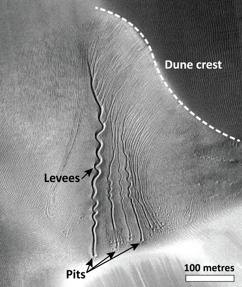 A marsi tél idején, mikor mínusz 120 Celsius-fokig is süllyedhet a hőmérséklet, a szén-dioxidból szárazjég alakul ki. A szárazjég, azaz szilárd állapotú szén-dioxid a tél végén, a homokdűnék felmelegedése miatt összetöredezik, és akár egy méter hosszú darabok is leszakadhatnak belőle. Egy bizonyos lejtési szög esetén ezek a darabok maguktól elindulnak lefelé a lejtőkön, és “beássák magukat” a talajba, mivel a dűnék alulról melegítik a jeget - ami a “normál” jéggel ellentétben nem vesz fel folyékony halmazállapotot, hanem egyből gázzá alakul -, és a képződő gáz szétrobbantja maga körül a homokot. A beágyazódott, és lefelé vándorló szárazjég tovább szublimál, és további robbanásokat okoz, a folyamat eredményeként pedig létrejönnek a sajátos, kígyózó árkok.