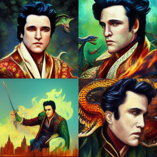 Mint látható, sikerült a Toldit Dark Souls esztétikával finomhangolni, szóval innen megszaladt a fantáziánk – a következő feladat: Elvis New Yorkban sárkánnyal harcol preraffaelita stílusban (ami esetében mintha a diszkó korszak találkozna a Harry Potterrel):