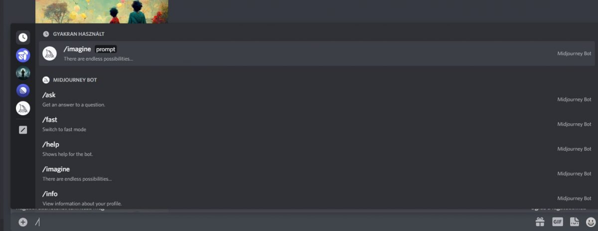 Ezután nincs is más dolgunk, mint begépelni a „/”-jelet, és utána a menüből kiválasztani az „imagine” szót.