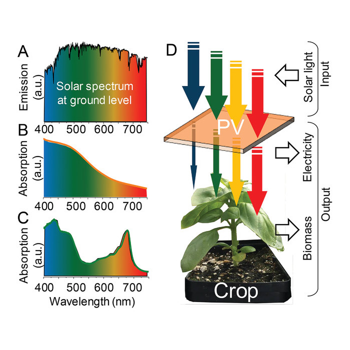 A Cambridge Egyetem kutatócsoportja kísérletében narancsszín, félig átlátszó napelem-táblák alá ültett spenót- és bazsalikom-palántáit. Elképzelésük szerint a zöld és kék fényt kiszűrő és azt energiatermelésre használó napelemek alatt a narancs és vörös fény elegendő lesz a növényeknek a fejlődéshez. A kísérlet eredményeit nem csak fizikai illetve biológiai, de gazdasági aspektusból is elemezték. Arra az érdekes következtetésre jutottak, hogy az elektromos energia és a növényi élelmiszerek együttes termelése annál gazdaságosabb, minél olcsóbb terményeket nevelünk a narancsszín napelemekkel fedett üvegházban.
