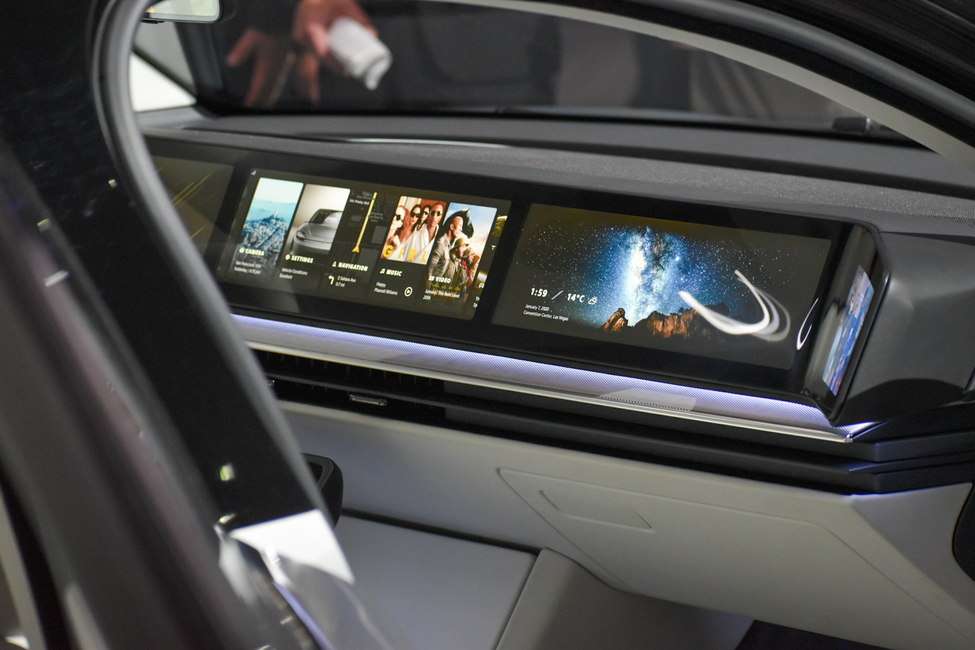 3 lidar és 17 egyéb szenzor mellett, vagyis a kocsi összesen 33 különböző érzékelővel van felszerelve. Az oldalsó visszapillantók helyén kamerákat találunk, amelyek képét az autó egész műszerfalán végighúzódó, érintésérzékeny kijelző (azaz a panorámakijelző) szélén látjuk. De kijelzőt találunk a középső visszapillantó helyén is, amelyen a hátsó kamera képét láthatjuk valós időben.