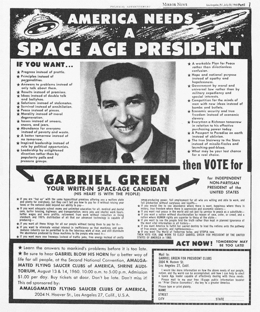 1960-ban elindult az elnökválasztáson az Univerzális Repülő Csészealj Párt színeiben, „Amerika egy űrkorszakbeli elnököt érdemel” szlogennel.