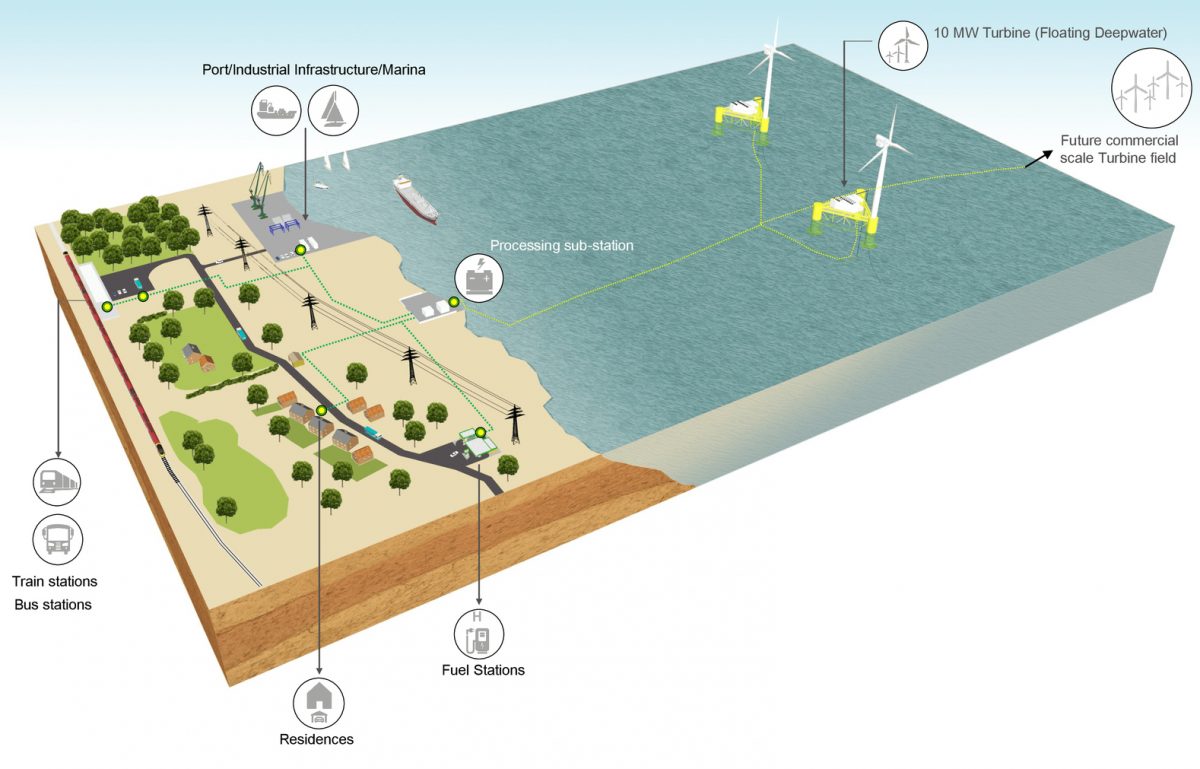 Ha a tengeren lévő szélturbina energiáját részben hidrogéngyártásra akarjuk használni, praktikus lehet helyben megoldani ezt is. Áram van, víz van, a technológiai folyamatok pedig teljesen automatizálhatók. A tengeren lebegő energiaközpontokból az energia és a hidrogén vezetékeken juthat el a szárazföldre, hasznosításra.