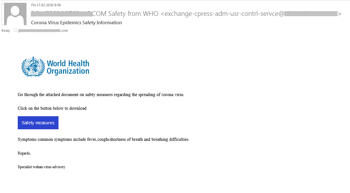 A felhasználók által kapott e-mailek küldői azt a látszatot igyekeznek kelteni, mintha a levelek a WHO-tól érkeztek volna, amelyek a koronavírus-fertőzést megakadályozó biztonsági intézkedésekről ígérnek tartalmakat. Amint a felhasználó rákattint az e-mailben található linkre, egy adathalász weboldalra kerül, és személyes adatok megosztását kérik tőle, ami végül a kiberbűnözők kezébe kerül. Az új scam-támadás sokkal fenyegeőbbnek tűnik, mint a korábban megismert Világbanktól vagy IMF-től érkező támogatásokat ígérő e-mailek.