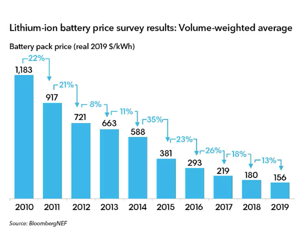 A lítium-ion akkumulátorok árai drámai csökkenést mutattak az elmúlt évtizedben. A Bloomberg New Energy Finance (Bnef) december eleji jelentése az árak folyamatos lefelé irányuló mozgásáról tájékoztat.
