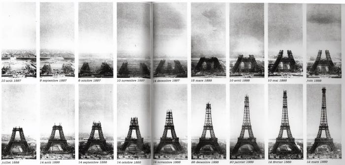 Az abszolút telitalálat, ami végül örökre beírta Eiffelt a történelembe mégis a párizsi Eiffel-torony lett; az épület háromszáz méteres magasságával kétszerese a római Szent Péter-bazilikának és a gízai piramisoknak, így nem csoda, hogy 1930-ig a világ legmagasabb építményének számított. Végül a New York-i, háromszáztizenkilenc méteres Chrysler Building letaszította képzeletbeli trónjáról, és a második helyre sorolta. Az építési munkálatok háromezer ember munkáját, két és félmillió szegecset igényelt, melyekkel összeilleszthették a tizennyolcezer-harmincnyolc, egyenként tízméteres, előre gyártott elemet, amitől a torony összsúlya hétezer-háromszáz tonnát nyomott. A kivitelezés két évet, két hónapot és két napot felölelt, összköltsége pedig hét és fél millió frankban állt meg. Egyúttal az Eiffel- torony volt az első olyan építkezés, melynek folyamatait fényképen is megörökítették.