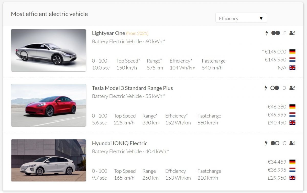 A villanyautók hatékonysági ranglistáján az első három helyezett, tehát az a három jelenleg kapható vagy hamarosan gyártásba kerülő kocsi, amely a legnagyobb távolságra tud eljutni adott energiamennyiséggel, nem meglepő módon nem SUV:
