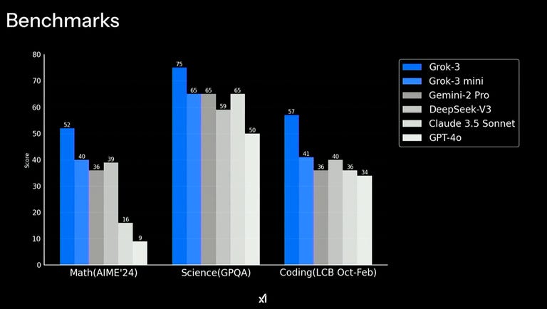 A Grok 3 a mesterséges intelligenciák matematikai képességeit mérő AIME '24 teszten, a PhD-szintű természettudományos (elsősorban biológiai, fizikai és kémiai) problémákat tartalmazó GPQA teszten valamint a programozási képességeket mérő LCB Oct-Feb teszten is kiemelkedő eredményeket ért el, maga mögé utasítva a GPT-4o-t, a Gemini-2 Prót, a DeepSeek-V3-at valamint a Claude 3.5 Sonnetet is.