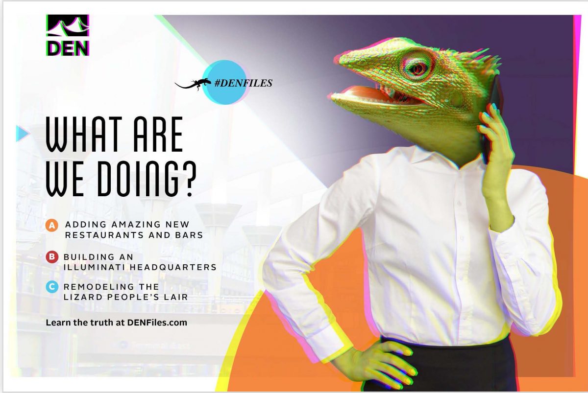 És akkor a slusszpoén. A reptér üzemeltetői is felültek a konteóvonatra és kiállítást rendeztek a reptér "titkos történetéről" és az Illunimátusokról, jó sok művészeti alkotással, afféle marketing akcióként. De nem ám amolyan statikus régimódi kiállítást, hanem jelmezes performanszokkal tarkított vetélkedőkkel tűzdelt fajtát, ahol a föld alatti létesítmények megtekintése a fődíj. A kiállítás plakátjain gyíkember szólítja meg az ara járót: "Mit csinálunk?" Majd választ is ad rá: "Átépítjük a reptiliánok járatait!"