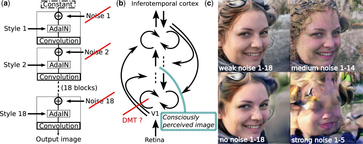 A tanulmányhoz használt egyik hálózat az Nvidia StyleGAN neurális hálózata, melynek a működését különböző erősségű zajhatással zavarták meg, hogy így modellezzék az N,N-dimetiltriptamin (DMT) nevű pszichoaktív alkaloid, egy intenzív hallucinogén hatását. A DMT az LSD-hez hasonlóan egy klasszikus pszichedelikus szer, amely szelektíven változtatja meg a szerotonin receptorok működését az idegrendszerben. Arról azonban keveset tudni, hogy ezek a változások pontosan miként is járulnak hozzá az ezen szerek használatával járó, megváltozott tudatállapothoz. A mostani kutatás célja tehát éppen ennek bizonyos fokú tisztázása volt. A képgenerátor működésének a megzavarásával vizuálisan hasonló eredményt értek el, amiről az említett szereket fogyasztók beszámoltak. Így aztán egyfelől mechanikusan is lehet modellezni és így jobban tanulmányozni ezt a hatást egy mesterséges hálózat segítségével, másfelől pedig az emberi DMT-fogyasztók verbális beszámolóit is ki lehet egészíteni tényleges, képi illusztrációkkal.