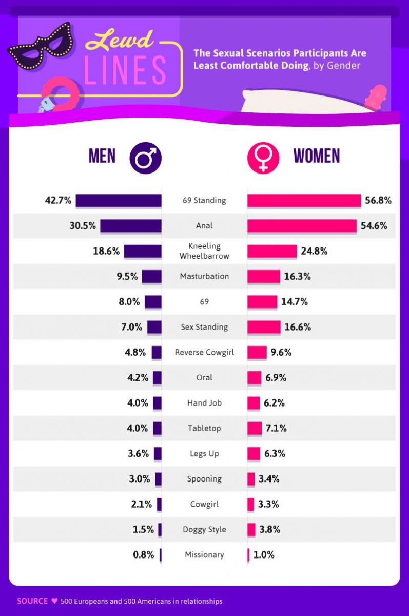 Hogy a legkevésbé sem reprezentatív kutatás talán legérdekesebb megállapításával kezdjük, a megkérdezettek szerint a legstresszesebb pozíció szexuális együttlét során az “álló testhelyzetben kivitelezett 69” lett. Úgy tűnik, hogy a fejjel lefelé lógva végzett ritmikus mozgás nem éppen az a testgyakorlat, amire akkor vágyunk, amikor éppen igazán jól szeretnénk érezni magunkat. Ezt szorosan követte az "anális szex", melyről a férfiak 30 százaléka és a nők csaknem 55 százaléka jelentette ki, hogy nem az ő asztala. A legkevésbé favorizált felállások dobogójának harmadik fokára, a komoly szorongással kecsegtető, úgynevezett “térdelő talicska” pozíció gurult fel.