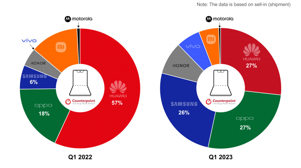 Az új kategória alaposan fel is forgatta az erőviszonyokat az országban: a tavalyi évig az összességében már csak a hatodik legnagyobb gyártónak számító Huawei piacvezető pozíciója megingathatatlan volt a hajlítható telefonok szegmensében, azonban az idei év elejére a Samsung és az Oppo is felzárkózott rájuk, miközben a kínai okostelefon-piacon hagyományosan a legnagyobbak közé számító Vivo, Xiaomi és Honor egyelőre meg sem tudja közelíteni a fenti hármast. Utóbbi két gyártó esetében ennek az oka teljesen nyilvánvaló, hiszen jelenleg még sem a Xiaomi sem pedig a Honor nem rendelkezik a Samsung Galaxy Z Fliphez hasonló, normál okostelefonná szétnyitható hajlítható készülékkel (azaz flip phone-nal), amelyek - már csak a kedvezőbb áruk miatt is - világszerte jóval kelendőbbek, mint a táblagéppé szétnyitható modellek.
