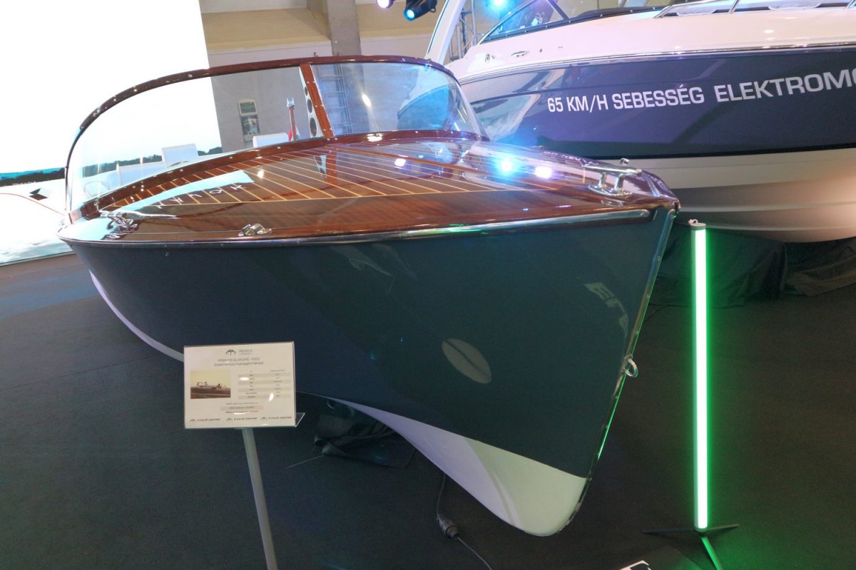 És láttunk még elektromos hajtással gyönyörű lakkozású, 2500 munkaórával készült fatestű motorcsónakot klasszikus dizájnnal (szintén magyar gyártmány):