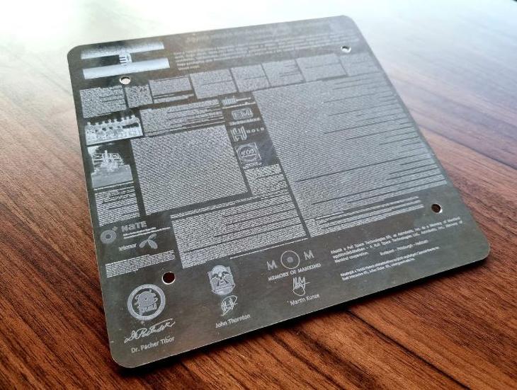 A plakett 20*20 centiméteres tábláján lézerrel bevésett szövegek és képek láthatóak, amelyeknek betűi olyan aprók, hogy csak tízszeres nagyításban lehet csak őket olvasni. A tábla speciális alumíniumötvözetből készült, így az űrbeli körülményeknek akár ötezer évig is ellen tud állni és emléket állít többek között Ádám Veronika biokémikus, Barabási Albert László fizikus, Freund Tamás neurobiológus, Karikó Katalin biokémikus, Kondorosi Éva biológus és Bay Zoltán fizikus, valamint az Aranycsapat számára, emellett a Vigyük Erdélyt a Holdra! projekt eredményeképpen Bartók Béláról és Erőss Zsoltról szóló holdjegyezetek is szerepelnek rajta. A Téridő Plakett kerámiából készült verzióját a hallstatti sóbánya mélyén is elhelyezik a Memory of Mankind programjának részeként.