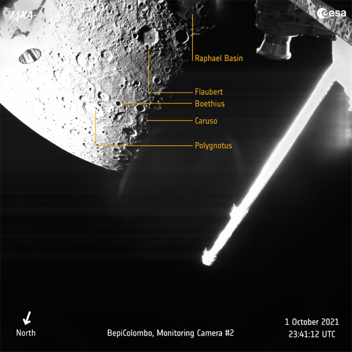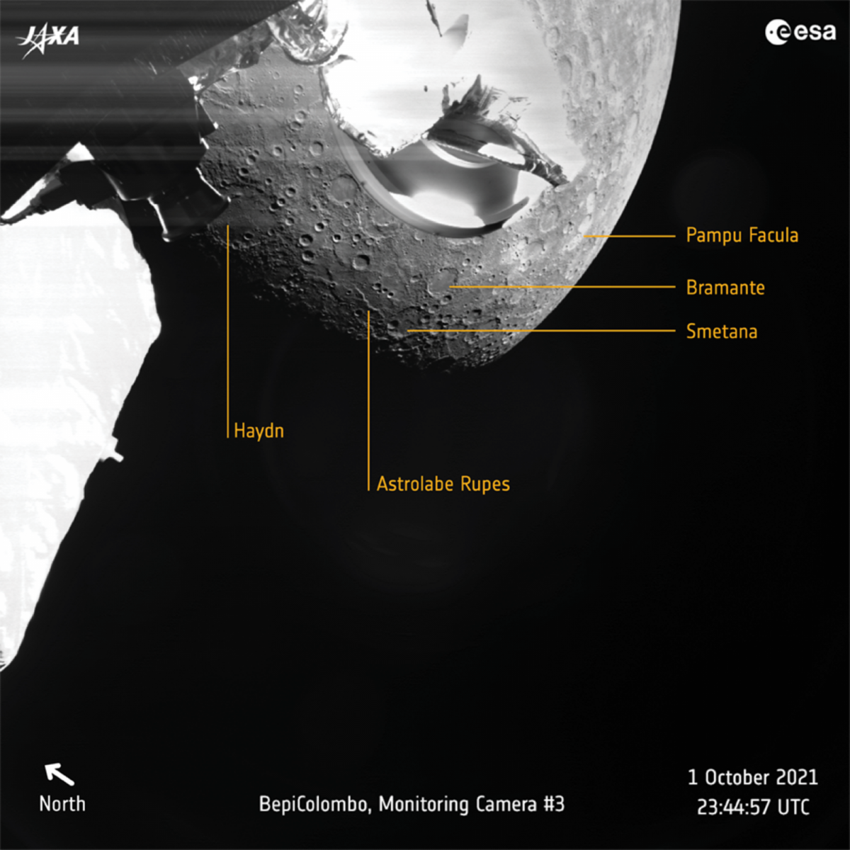 A felvételeken megjelölték az egyes krátereket is, így felismerhető például a 251 kilométer átmérőjű Haydn, vagy a valamivel nagyobb, 342 km átmérőjű Raphael kráter, a Pampu (ami tamil nyelven kígyót jelent) Facula, ez egy világos régió, amit egy egykori vulkáni kitörés piroklaszt üledékéből áll vagy az Astrolabe Szakadék, ami Dumont d'Urville francia felfedező hajójáról kapta a nevét. A kráterek mérete eltörpül a bolygó legnagyobb kiterjedésű krátere, a Caloris Medence mellett, amely 1525 kilométeres kiterjedésével az égitest leglátványosabb régiója, de erről egyelőre nem rögzített képeket a BepiColombo.