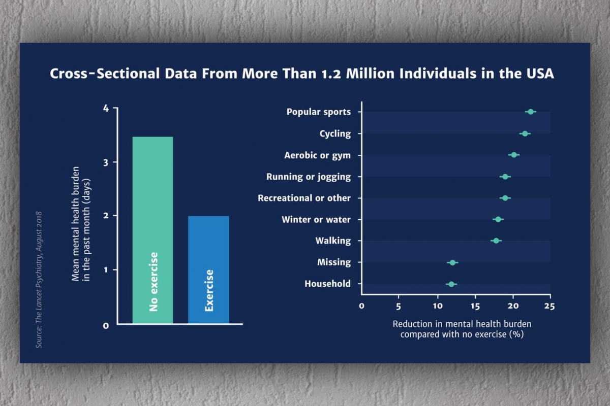 A felmérés egészen érdekes összefüggéseket talált a mozgás és a mentális egészség között. A fő megállapítás, ami nem függött sem a válaszadók testtömeg-indexétől, sem az egészségi állapotuktól, sem a koruktól vagy a rasszuktól, hogy