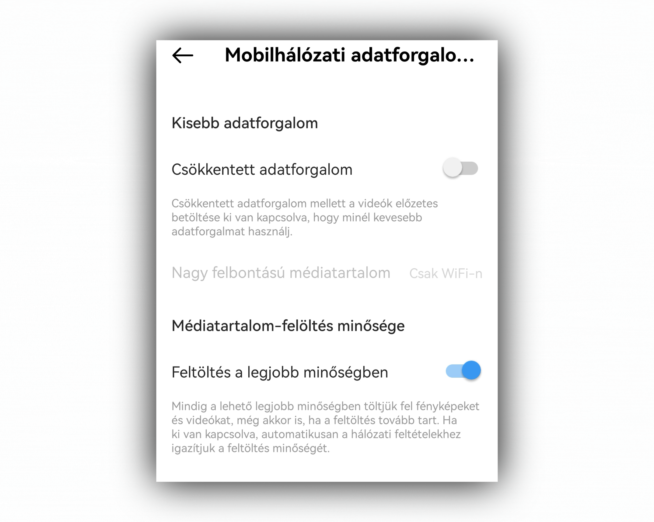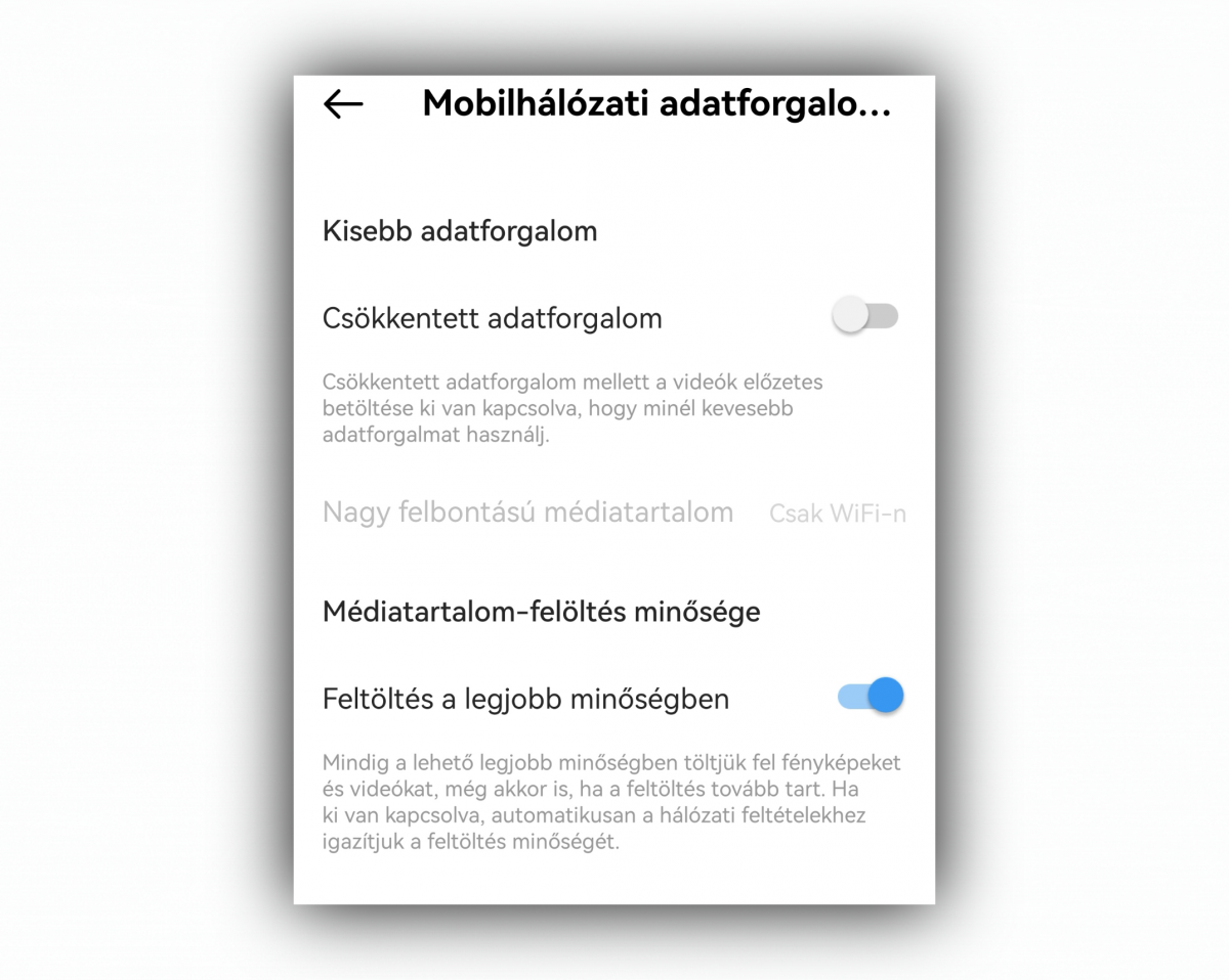 Itt kapcsoljuk át a "Feltöltés a legjobb minőségben" felirat melletti kapcsolót, hogy az kéken világítson.