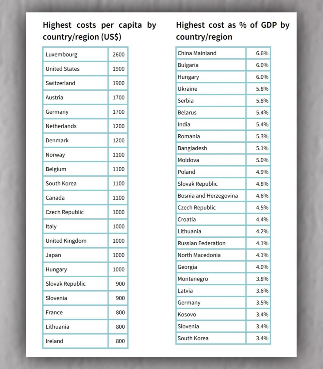A szálló porból, nitrogén-dioxidból és ózonból fakadó légszennyezés Kínának okozta a legnagyobb károkat (az ország GDP-jének 6,6%-át), rögtön utánuk pedig holtversenyben következik Magyarország és Bulgária, ahol a rossz levegő a bruttó hazai termék 6%-át kitevő gazdasági kiesést okozott. Ez Magyarország esetében évi 9,4 milliárd dollár, vagyis 2845 milliárd forint. Az összeg amúgy nagyjából megegyezik a budapesti olimpia becsült (közvetlen és közvetett) költségeivel.