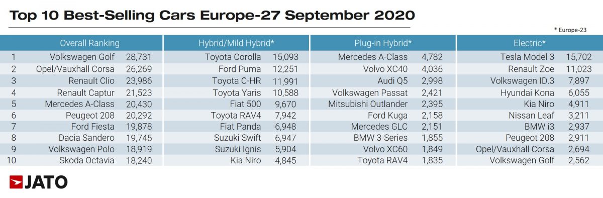 A plug-in hibridek közül Európában a Mercedes A-osztály konnektorról is tölthető autója a legsikeresebb modell, de az összesítésben is a Mercedes vezeti a plug-in hibridek eladási listáját a Volvo és a BMW előtt. (Halkan megjegyezzük azért, hogy a Mercedes kínál konnektorról is tölthető dízel hibrid modelleket is.) A tisztán elektromos autók közül pedig a Tesla Model 3 a kedvenc, őt követi a Renault Zoé és a Volkswagen új villanyautója, az ID.3. A klasszikus hibridek bajnoka természetesen a Toyota.
