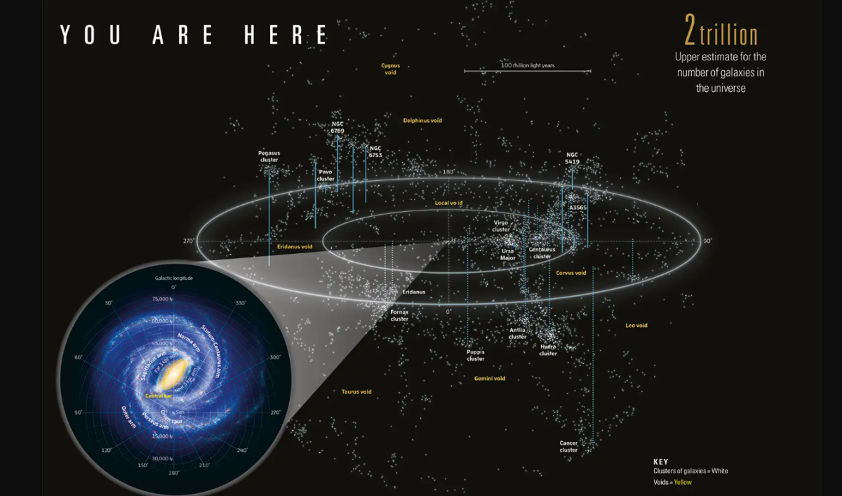 Ez a kozmikus térkép ugyanis elég érthetően megmutatja a Föld helyzetét az óriási univerzumban – a térkép minden irányban 200 millió fényévre terjed. A Naprendszernek helyet adó a Tejútrendszer a Lokális galaxiscsoport központi részén helyezkedik el. A legközelebbi galaxishalmaz, tehát a nagyléptékű szomszédunk a Virgo szuperhalmaz.