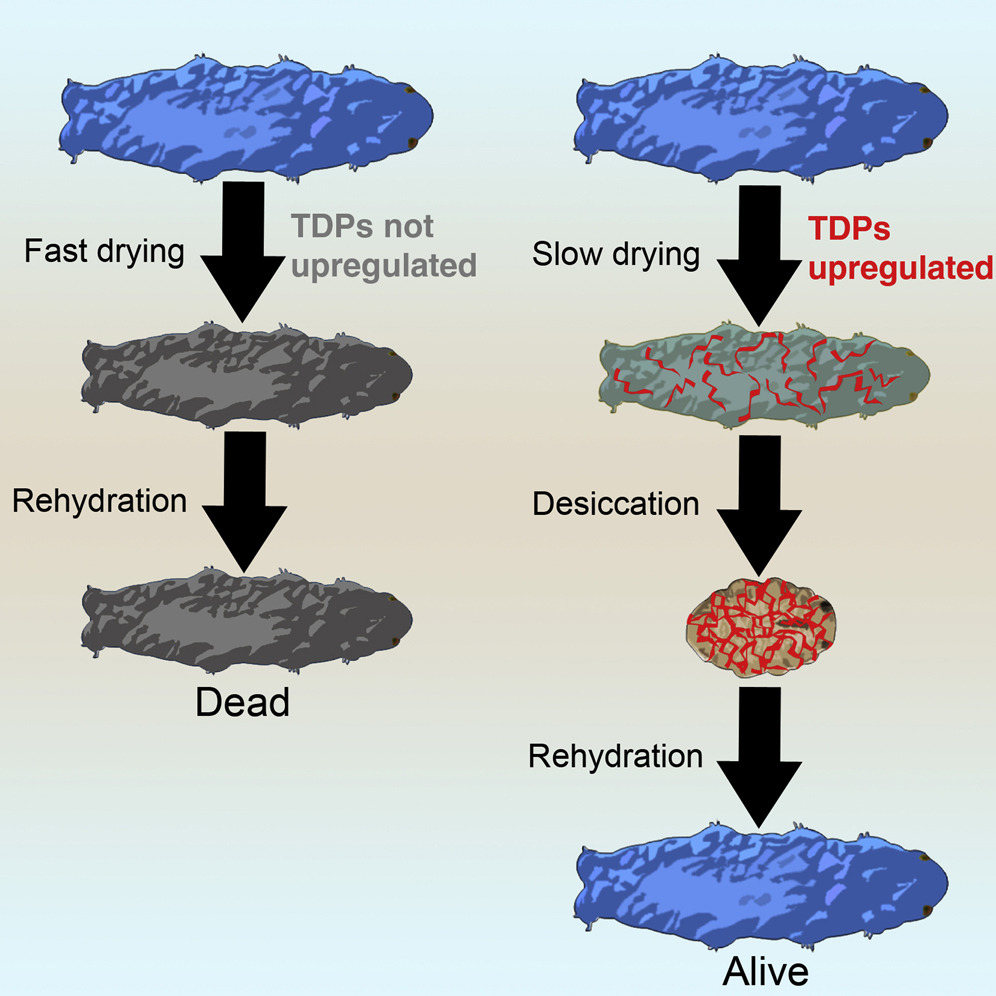 A kutatók azt vizsgálták, hogy a kiszáradás mely géneket aktiválja az állatban, és ekkor fedezték fel, hogy először azok a gének kapcsolnak be ilyenkor, melyek az említett TDP-ket kódolják. Thomas C. Boothby, a publikáció biológus társzerzője úgy nyilatkozott a hírt eredetileg közlő Wired magazinnak, hogy rendkívül izgalmas kérdés, hogy egy meghatározatlan térszerkezet nélküli fehérje miként képes betölteni a funkcióját a sejtműködésben. A kérdésre még talán nincs pontos válasz, de a TDP-ket kifejező gének jelentőségét már sikerült bizonyítani. Mikor ugyanis ezeket elnyomták az állatokban, azok túlélési esélye is jelentősen csökkent. Ugyanakkor amint ezeket a géneket bejuttatták olyan élőlényekbe, melyekben ilyenek eddig nem fordultak elő (baktérium, élesztő), úgy azok egyből jobban ellenálltak a kiszáradásnak. Adott esetben akár 100-szor jobban, mint korábban. A fehérje ugyanis lényegében beavatkozik abba a folyamatba, amit kiszáradásnak hívunk. A kiszáradás esetén ugyanis a sejtek kikristályosodnak, ami miatt az azokban található fehérjék és DNS is széttöredezik. A TDP azonban beleszól ebbe, mintegy "megszelídíti" magát a kiszáradást. A sejt ennek hatására nem kikristályosodik, hanem "megüvegesedik", lényegében apró üveggolyóvá válik, és így túlélheti a kedvezőtlen körülményeket. Ezután vízbe helyezve az állatka feléled, ami nem történhetne meg, ha a DNS-e és a fehérjéi a kiszáradás miatt visszavonhatatlanul károsodtak volna, mint alapesetben.