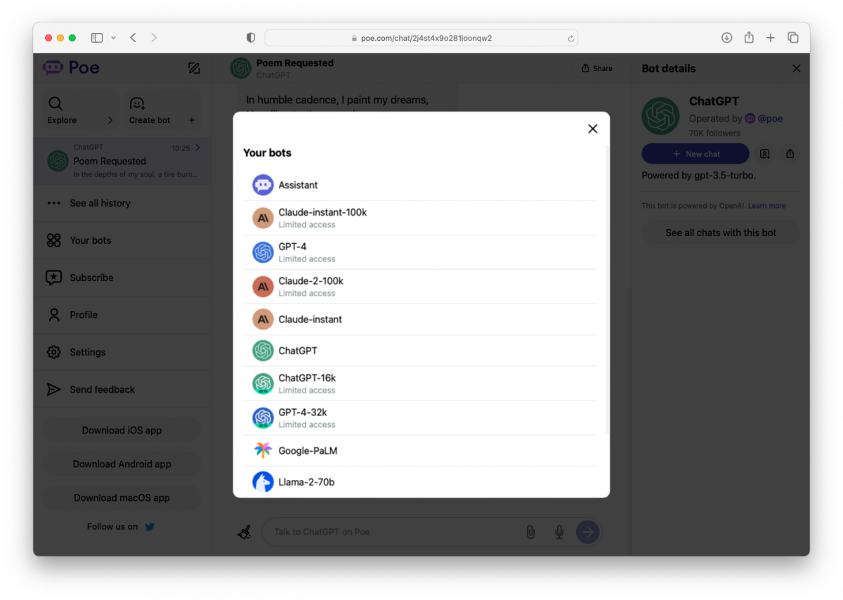 Ezt ráadásul mostantól a web mellett Android és iOS alkalmazással, és natív, azaz telepíthető macOS programmal is megtehetjük. A Poe-n keresztül elérhetjük a 3.5-ös, és a 4-es ChatGPT-t, de akár a Meta által létrehozott Llama 2 modellt is. Ami a professzionális felhasználók számára vonzó lehet, hogy havi húsz dollárért minden, a rendszer számára hozzáférhető botot használhatunk, a fizetőseket is. Emellett újdonság, hogy egyetlen bottal több, párhuzamos beszélgetést is folytathatunk.