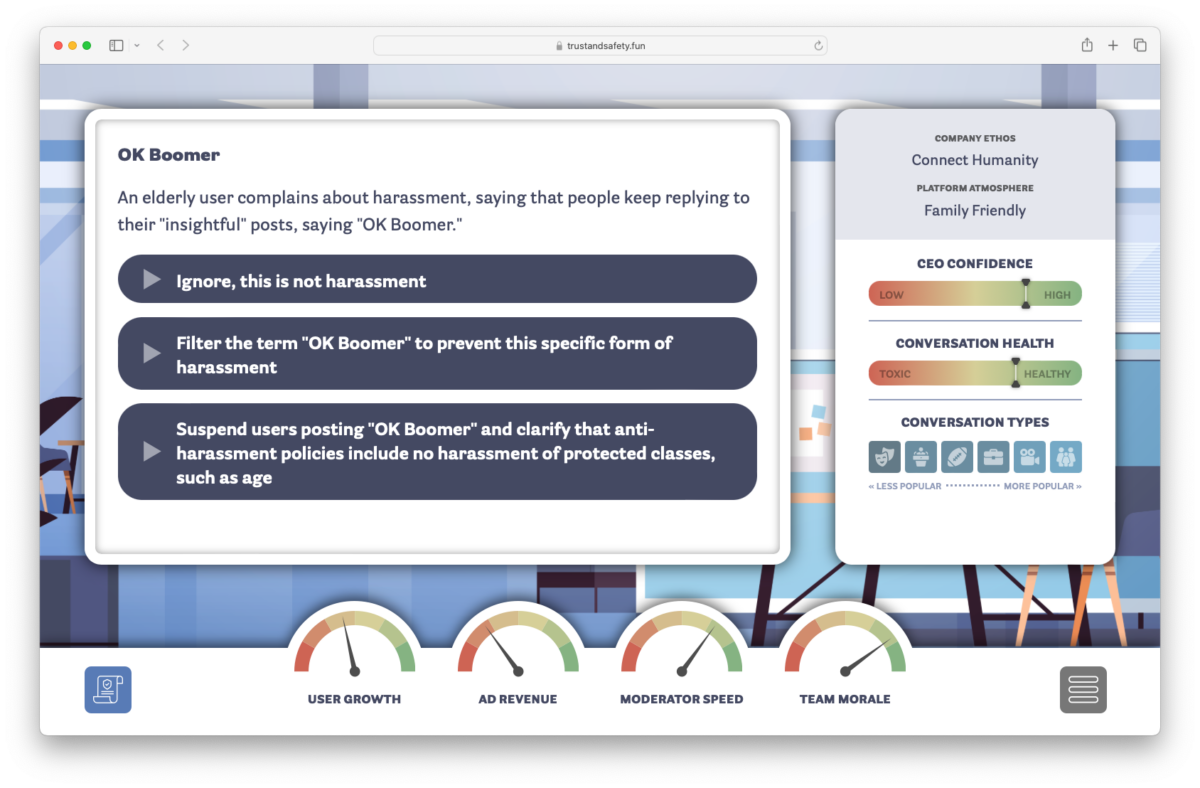 Az úgynevezett Trust & Safety (bizalom és biztonság) osztályok felelőssége, hogy meghozzák azokat a döntéseket, amelyek alapján a vállalat által alkalmazott vagy megbízott moderátorok ezrei, tízezrei el tudják dönteni, hogy egy-egy poszt fent maradhat-e az oldalon, vagy sem. Ez pedig cseppet sem könnyű feladat. A most megjelent, ingyenes, böngészőben játszható Trust & Safety Tycoon erre világít rá, hiszen a játékosnak egy ilyen osztály vezetését kell átvennie. Tőle kérdezi meg a vezérigazgató, hogy családbarát vagy inkább vitriolos vitákra berendezkedett szolgáltatást építsen, majd érkeznek szépen sorban a kérdések arról, hogy felnőtt férfiak írhatnak-e bejegyzéseket az Én kicsi pónimról, egyes kisebbségek sértegethetik-e önmagukat, vagy épp lehet-e kalóz oldalakra mutató linket megosztani. Minden döntés befolyásolja azt, hogy jönnek-e új felhasználók, nő-e a reklámbevételünk, milyen sebességgel tudnak dolgozni a moderátoraink - és persze azt is, hogy a vezérigazgató mennyire bízik bennünk. Azt pedig tudjuk, hogy mi történik azokkal a vezetőkkel, akikben nem bízik a főnökük.