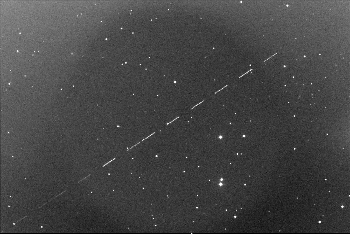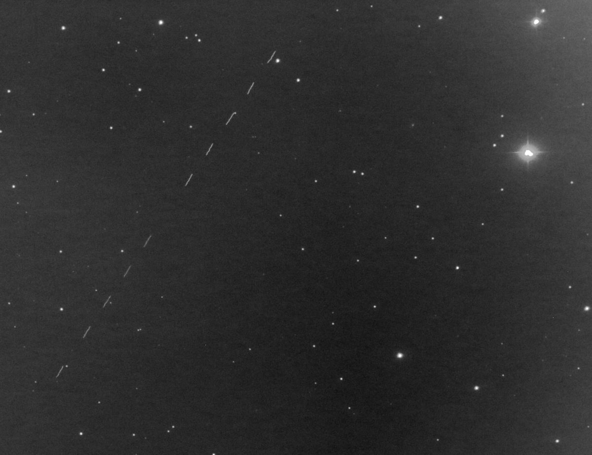 "mivel a távcső a csillagokat követi, ezért a Naprendszerben gyorsan mozgó kisbolygó csíkot húz a felvételen.