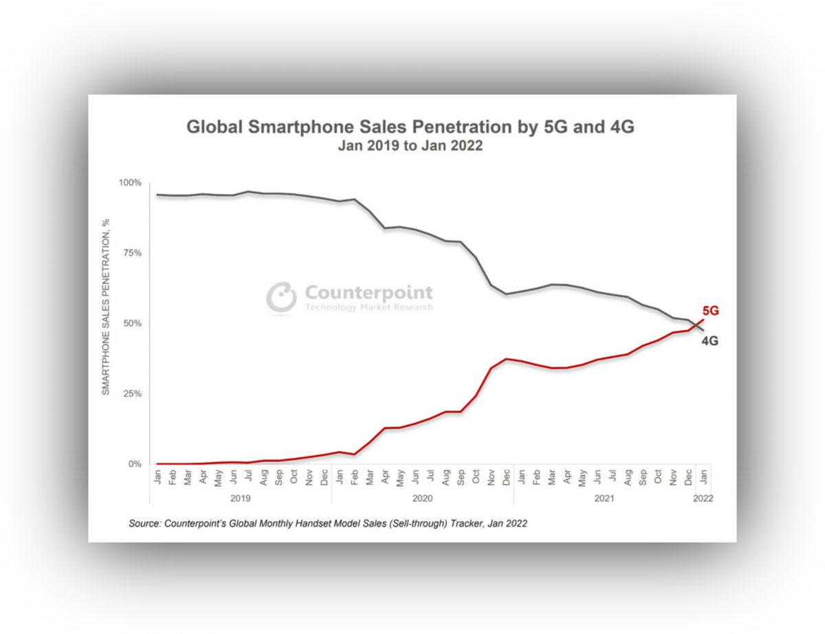 A Counterpoint Research piacelemző statisztikái szerint januárban a világszerte értékesített okostelefonok 51%-a rendelkezett 5G adatkapcsolattal, így az új adatátviteli technológia megjelenése óta most először történt meg, hogy egy hónapban több 5G-s telefont adtak el, mint olyat, ami csak 4G-s adatkapcsolatra képes.